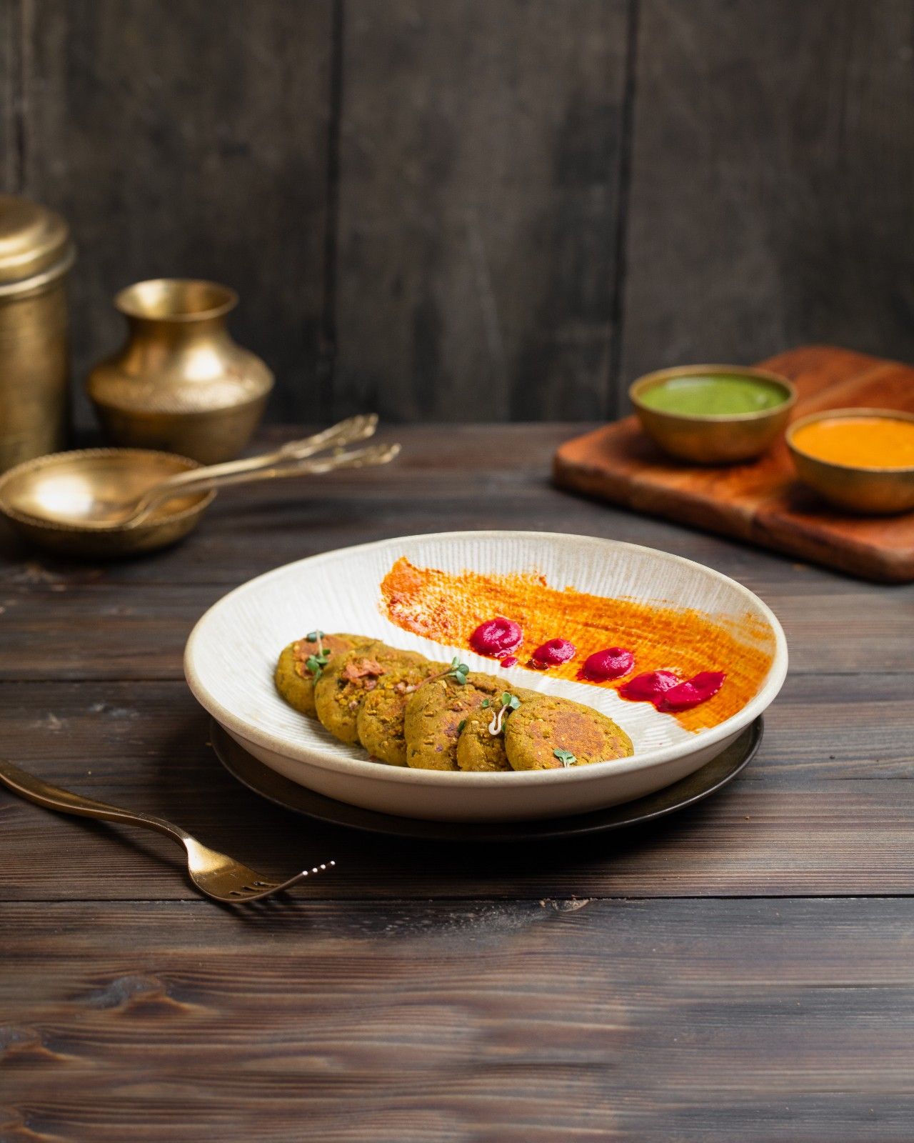 A delicious vegetable beetroot kebab with a cheesy filling served with smocky bell pepper chutney.